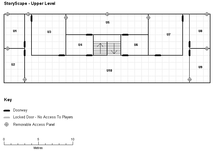 The year is 2456. You are crewmen aboard the USS Endeavour, a starship in the Space Service of the Union of Sovereign Worlds. Your mission is to patrol the far frontiers of the Union, searching for new peoples and new worlds. GM's Overview This is one of StoryScape's most popular settings. Some unkind people have suggested that Danny has "ripped off" a popular TV and film serial, and in fact he is the subject of an ongoing legal investigation, but he doesn't worry himself about that. Note:- When we played this game we used this as part of the backstory. One of the characters was a lawyer working for a legal firm specialising in copyright issues. He was assigned to go undercover as a player at StoryScape to gather evidence. To fill out his cover story he organised his visit as a company outing, by putting up a notice on the notice board in the canteen. So the other players were all fellow workers of his, each paying to go in their own time (whilst he was on double-time and expenses). The starship has a crew of 8 officers and 24 ratings (which means you can afford to waste a fair number of "red shirts"). Location Description The USS Endeavour is roughly oblong, with its longer edge perpendicular to the direction of travel. It has two engine pods - one at either side - which are totally automated (there is no access to characters). The front half of the ship contains two decks, the upper command deck, and the lower residential deck. The rear half of the ship consists of a large combined hanger and shuttle deck. The rooms on the lower deck are: Back Area: The hanger / cargo deck. A single shuttle craft is parked in the centre (this is a wooden mockup which the VR goggles make appear as a gleaming, white shuttle). There are also a number of large storage boxes which contain various engineering stores. Lobby: The docking reception area. On the bow wall of this area is the entrance to the docking port / airlock. When the starship is docked with a space station this is how personal enter and leave. At the stern wall of this area are the stairs that lead to the Upper Command Deck (yes stairs... this is a starship with stairs... you got a problem with that mister). L1: Other Rating's Quarters. Six bunks and a small bathroom. L2: Other Rating's Quarters. Six bunks and a small bathroom. L3: Refreshment Room. This is a combined rest area / canteen / galley / bar. L4: General Officer's Quarters. Three bunks, a desk and a small bathroom. L5: Captain's Quarters. Contains a single bunk and a desk as well as a small separate bathroom. L6: First Officer's Quarters. As Captain's quarters. L7: Gymnasium. L8: General Officer's Quarters. Three bunks, a desk and a small bathroom. L9: Other Rating's Quarters. Six bunks and a small bathroom. L10: Other Rating's Quarters. Six bunks and a small bathroom. The rooms on the upper deck are: U1: Storage Area. U2: Briefing Room. U3: Sickbay. U4: Computer Room. U5: Engineering. This area contains the reactor that powers the ship as well as various control consoles. U6: Communications / Sensors Room. U7: Science Lab. U8: Storage Area. U9: Weapons Room. U10: Bridge. This area contains a central seat for the captain, a number of consoles for various personnel and a large view screen set into the bow wall. |