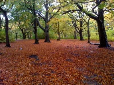 entirely covered by fallen, brown leaves, forcing your owner to spend several minutes